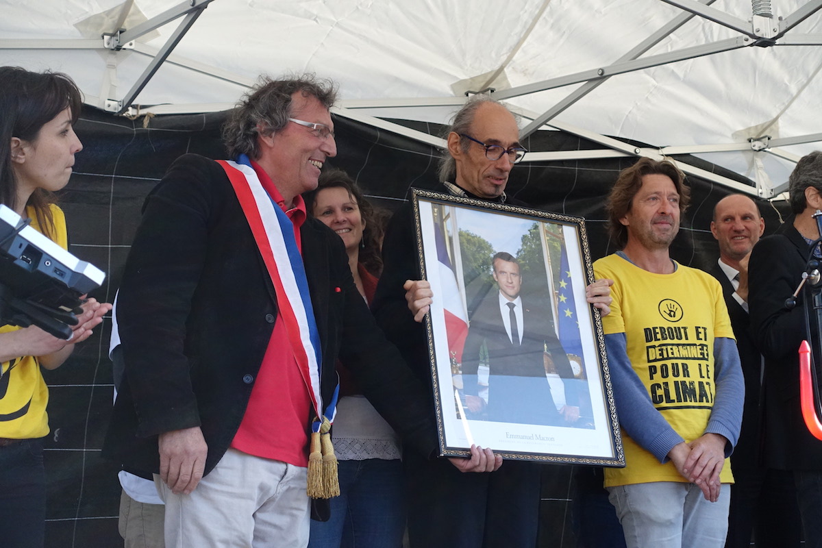 Après l'audience, le maire de Pérouges (Ain) a remis le portrait du président de la République de sa commune aux « décrocheurs ».