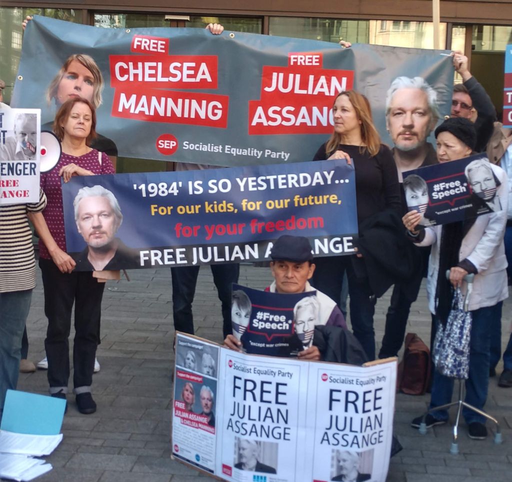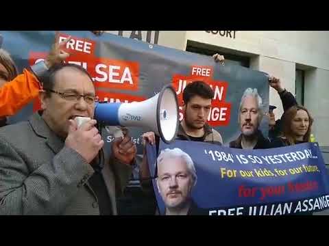 En dehors du tribunal, les partisans de Julian Assange ont fait sentir leur présence avec une protestation déterminée organisée par le Julian Assange Defence Committee (JADC) et soutenue par le Parti de l'égalité socialiste (SEP). Ils ont chanté des slogans comme «Les États-Unis, le Royaume-Uni bas les pattes d'Assange!». «Il n'y a qu'une seule décision: pas d'extradition!» et «Dire la vérité n'est pas un crime libérez Julian Assange».