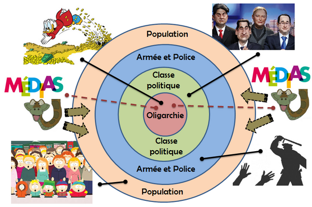 Le schéma ci-dessous illustre le système de protection du pouvoir oligarchique (8) à travers plusieurs cercles concentriques :