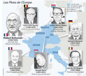 Pour la France, le choix de Jean Monnet fut une évidence de part ses liens étroits avec l'establishment américain et la CIA, l'ex. collaborateur sans convictions personnelles du régime de Vichy Robert Schuman fut également de la partie. Pour l'Allemagne, on recycla l' ancien nazi Walter Hallstein qui devint plus tard le premier président de la commission européenne.