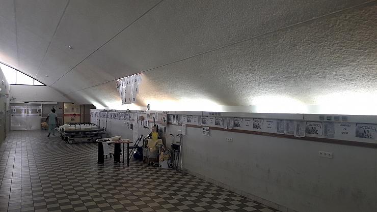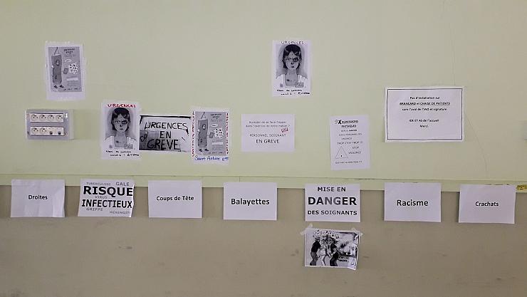 Puisqu'il est impossible de bloquer le fonctionnement du service, dans un premier temps « l'aspect symbolique s'est révélé essentiel », pointe Abdel. Tout en s'affairant auprès des usagers, les grévistes arborent des autocollants « Urgences en grève ». Leur mouvement s'inscrit aussi dans le décor du lieu de travail : les portes vitrées, les couloirs, l'accueil, sont constellés d'affichettes annonçant les mots d'ordre de la grève, et reflétant l'immense ras-le-bol du personnel. Tentée, au début, de les faire retirer, la direction a fini par renoncer.