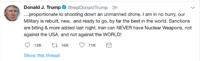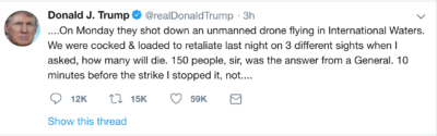 « Ce Lundi (sic), ils ont abattu un drone survolant les eaux internationales. Hier soir, sur 3 sites différents, nous étions prêts à riposter, le matériel était chargé, quand j'ai demandé, combien de personnes y trouveraient la mort. Un général a répondu 150 personnes. 10 minutes avant la frappe, je l'ai arrêtée, car non... proportionnée au fait d'abattre un drone sans pilote. Je ne suis pas pressé, nos forces armées ont été mises à niveau, elles sont modernes et prêtes à l'emploi, ce sont de loin les meilleures au monde. Les sanctions déjà sévères ont été renforcées hier soir. L'Iran ne pourra JAMAIS avoir d'armes nucléaires, ni contre les USA, ni contre le MONDE ! »