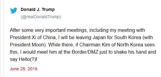 Après quelques réunions très importantes, y compris ma rencontre avec le Président Xi de Chine, je quitterai le Japon pour la Corée du Sud (avec le Président Moon). Pendant que j'y serait, si le président Kim de Corée du Nord voit ça, je le rejoindrais à la frontière/DMZ juste pour lui serrer la main et lui dire bonjour(?)!