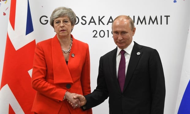 Theresa May n'a pas tenté de masquer son malaise en serrant la main de Vladimir Poutine. Photo Reuters