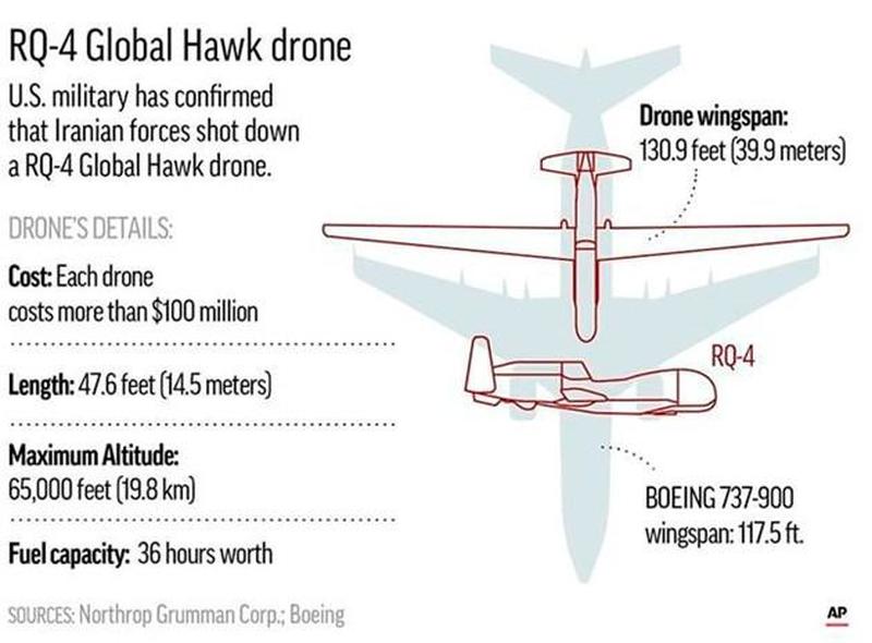 Les drones comme celui qui a été abattu jeudi sont décrits comme des « plateformes de surveillance massive » et sont en service depuis 2001. Ils ont une envergure de plus de 40 mètres et un poids au décollage de plus de 16 tonnes. Son rayon d'action est de plus de 22 000 kilomètres, ils peuvent voler jusqu'à 20 000 mètres d'altitude et pendant 34 heures d'affilée. Ils n'ont aucune capacité offensive et peuvent coûter jusqu'à 220 millions de dollars chacun.