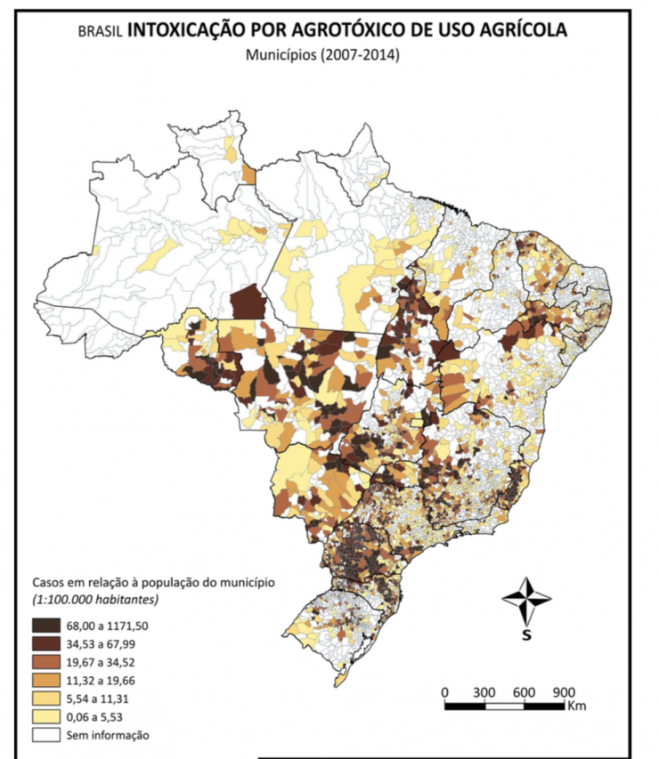 Voir : Atlas dos Agrotóxicos (en portugais) et en anglais A Geography of Agrotoxins use in Brazil and its Relations to the European Union.