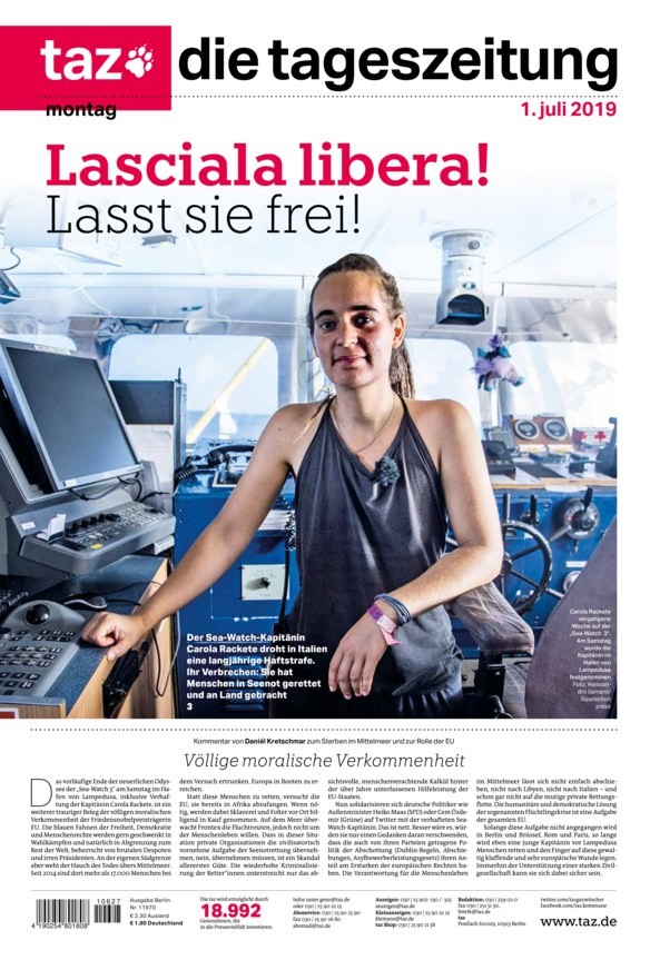 Le lundi 1er juillet 2019, le quotidien berlinois TAZ (die Tageszeitung) a consacré sa une à l'héroïne allemande du jour, Carola Rackete, capitaine du bateau Sea-Watch 3, qui devait passer devant une juge d'instruction du tribunal d'Agrigente pour le crime d'avoir transporté dans les eaux italiennes des boat-people sauvés en Méditerranée. La juge a levé son assignation à résidence.