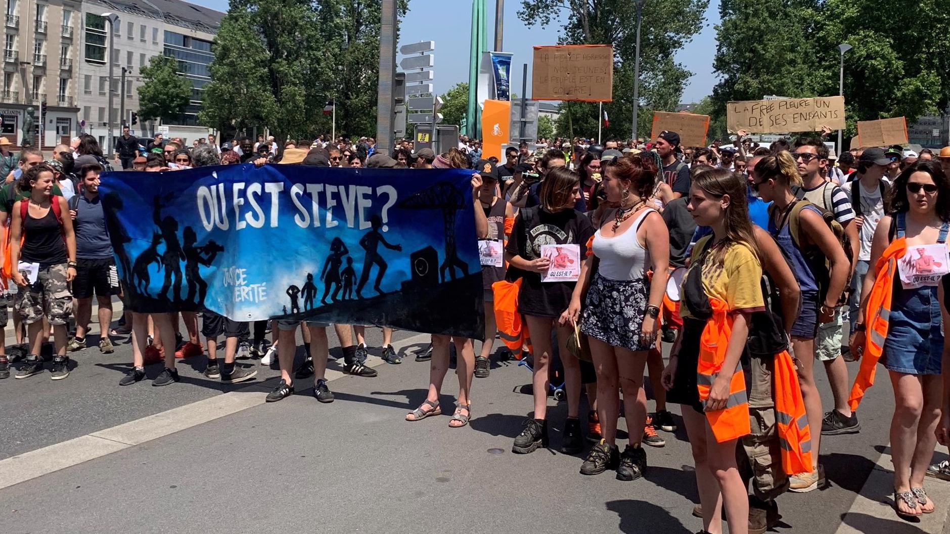 Manifestation samedi à Nantes contre la disparition de Steve Carico, qu'on craint noyé suite à une agression policièreL'attaque policière a eu lieu la veille d'une marche de 1.000 jeunes contre la violence policière à Nantes, la sixième plus grande ville du pays. Les manifestants ont réclamé justice pour Steve Caniço, un animateur de 24 ans disparu le 21 juin et qu'on craint noyé dans la Loire. Il avait disparu au cours de la répression policière d'un festival de musique techno cette nuit-là. Les manifestants portaient une banderole demandant : «Où est Steve ?»