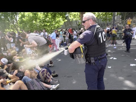 Pendant les 10 minutes qui suivent, les policiers se promènent dans le groupe, aspergeant directement, à 20 centimètres du visage, ceux qui sont assis. Ils leur arrachent aussi leurs lunettes de protection, alors que des dizaines de spectateurs filment avec leur téléphone et protestent en huant la police.