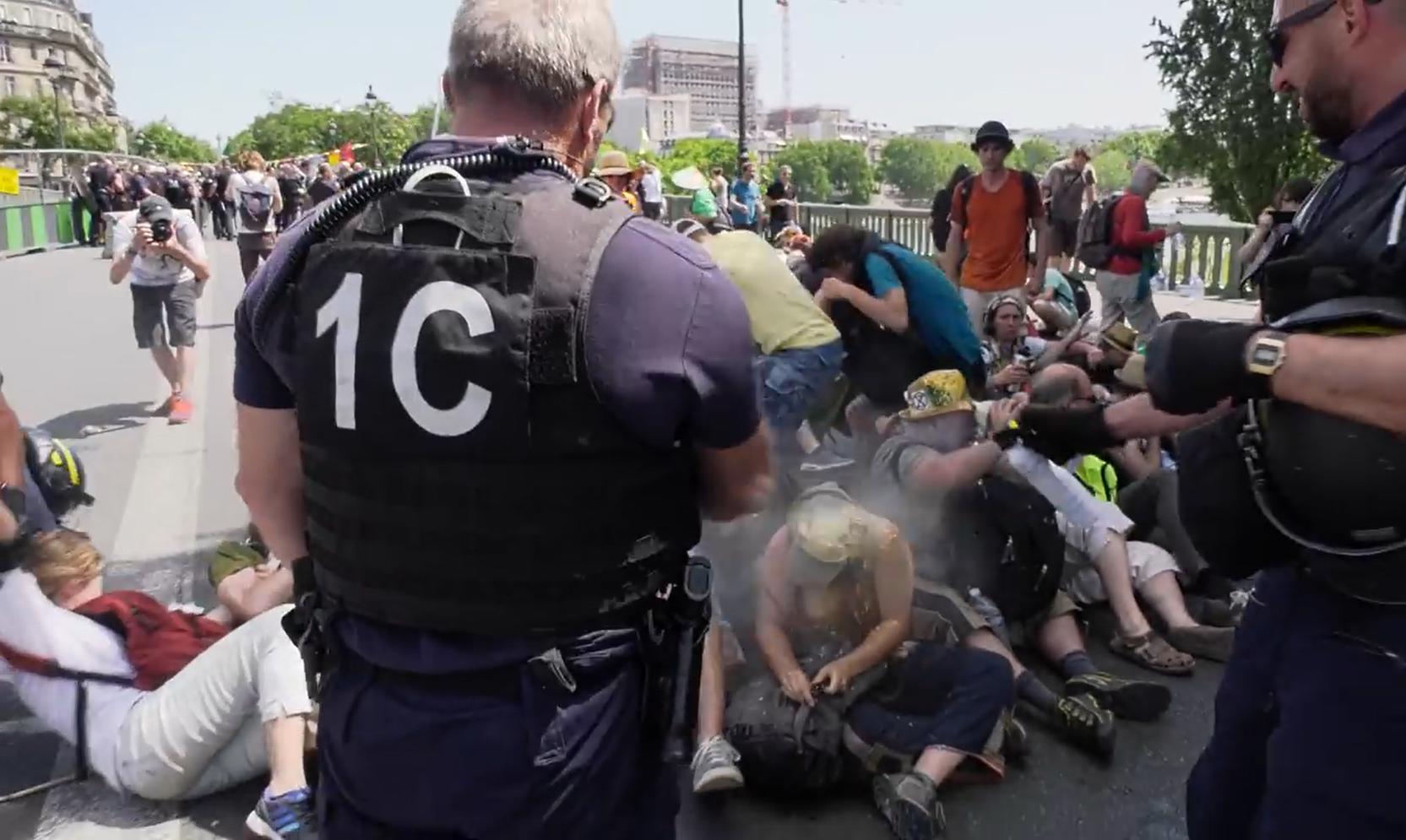 Dans l'acte de violence policière le plus récent en France, des dizaines de policiers anti-émeute (CRS) ont encerclé un groupe de manifestants pacifiques en sit-in contre le changement climatique sur un pont parisien, les ont aspergés de gaz poivré et agressés.