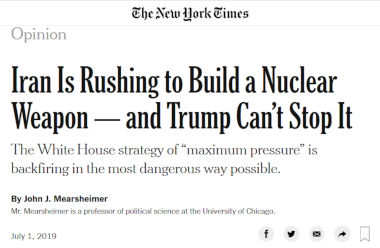 Mearsheimer n'est peut-être pas responsable du titre de cette infox. Le NYT est généralement anti-iranien et certains de ses rédacteurs sont d'affreux bellicistes. Mais même si les affirmations faites dans le titre sont fausses, elles ne sont pas éloignées de ce que Mearsheimer écrit.