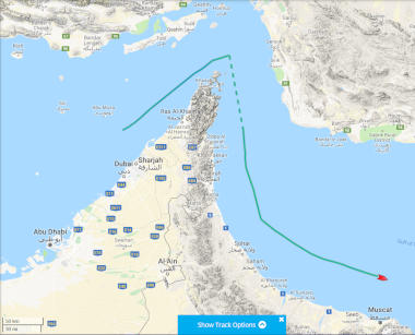 Il est également intéressant de noter que le navire avait coupé son signal AIS, voir la ligne pointillée, pendant son passage dans le détroit d'Ormuz.