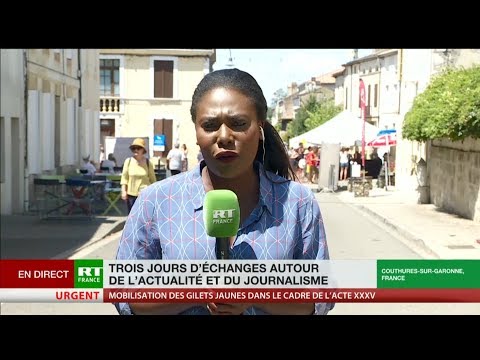 - Au Festival international du journalisme qui se déroule les 12, 13 et 14 juillet dans le village de Couthures-sur-Garonne (Lot-et-Garonne), le traitement médiatique du mouvement des Gilets jaunes est abordé, comme l'explique la reporter de RT France.