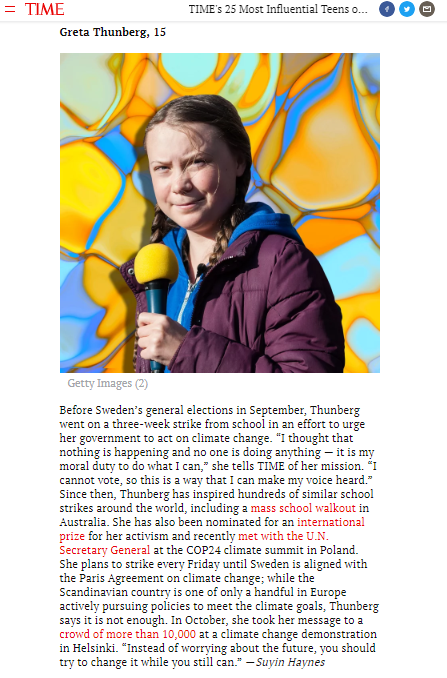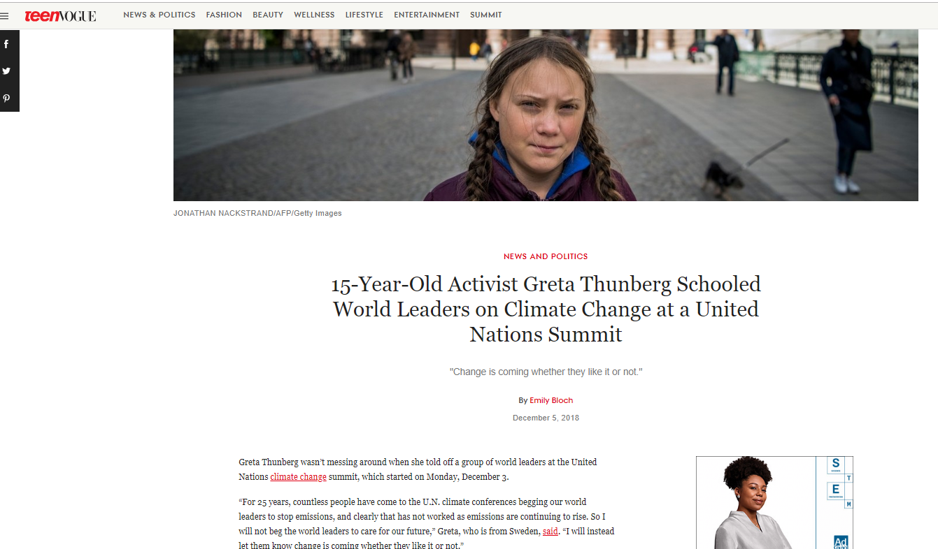 Teen Vogue, 5 décembre 2018 : « La militante de 15 ans Greta Thunberg a fait la leçon à des dirigeants mondiaux sur le changement climatique lors d'un sommet des Nations Unies. »