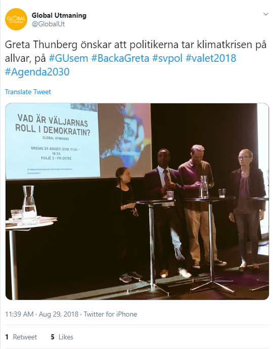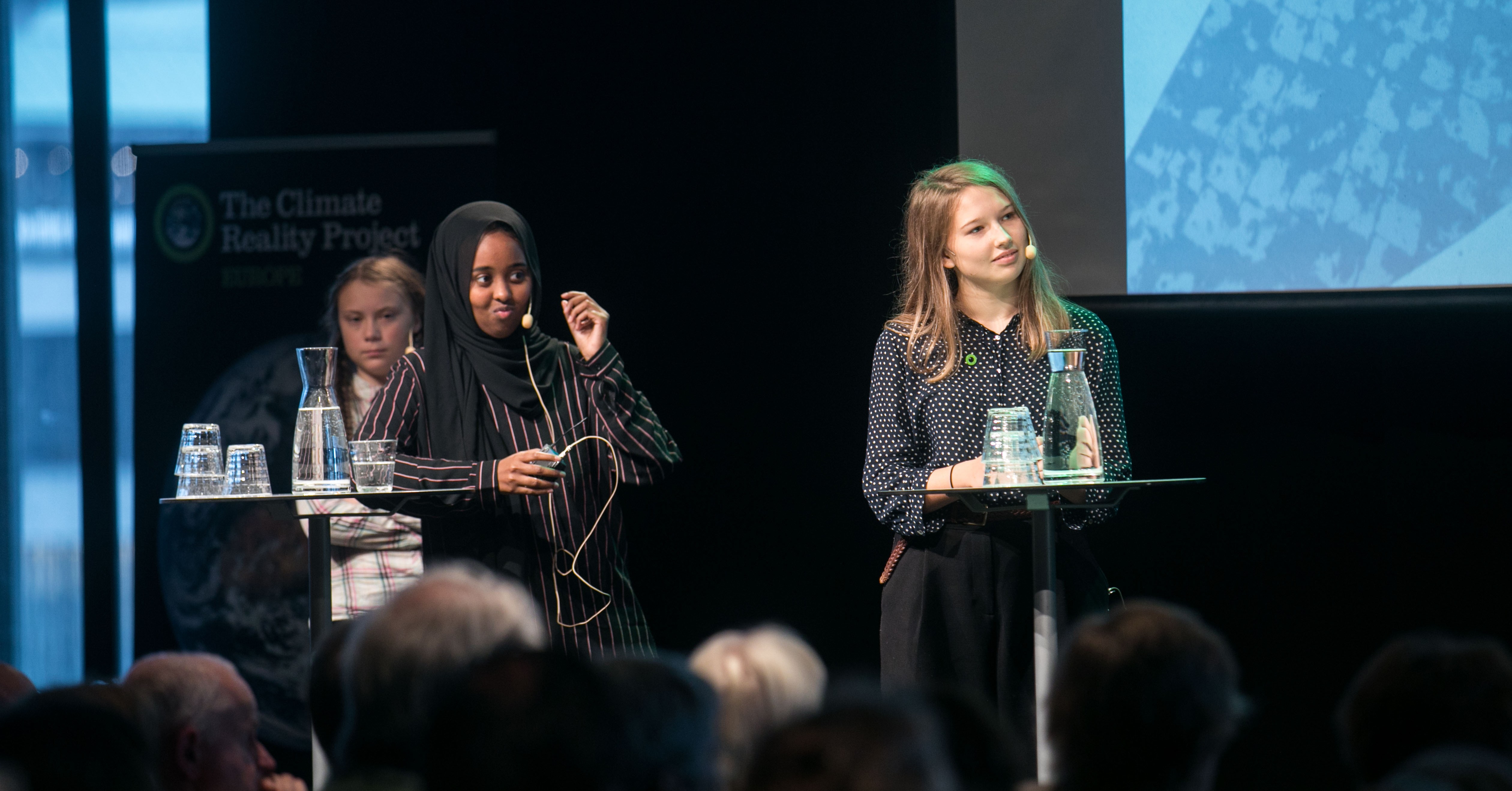 Le Climate Reality Project et Global Utmaning. Greta Thunberg à l'extrême gauche. « Comment faire en sorte que les décideurs d'aujourd'hui bénéficient de l'engagement des jeunes pour l'avenir et en tirent des enseignements ? Le 26 septembre, la question a attiré plus de 250 visiteurs au Kulturhuset Stadsteatern, où Global Utmaning et le Climate Reality Project d'Al Gore avaient organisé des séminaires. » (Source)