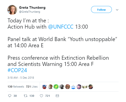 « Aujourd'hui je suis à l'Action Hub avec @UNFCCC 13:00 Table ronde à la Banque Mondiale « Jeunesse indomptable » à 14:00 Conférence de presse avec Extinction Rebellion et Scientists Warning (les Scientifiques Préviennent) 15:00 Zone F #COP24
