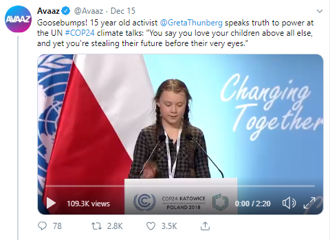Au lendemain du communiqué de presse de 350.org-Avaaz, le 15 décembre 2018, les ONG et les institutions se sont empressées de catapulter les mots de Thunberg jusque dans le cœur et l'esprit des citoyens du monde entier. De l'ONU, à Avaaz, à la Banque mondiale, aux militants populaires, ils ont tous réclamé à grands cris la diffusion des paroles de la jeune Thunberg. Mais une ONG a pris l'initiative de censurer bon nombre des propos de Thunberg, publiant une version abrégée (79K vues sur Facebook). Sans en avertir son auditoire, Avaaz a censuré quatre extraits du discours de Thunberg. Les deux extraits qui suivent, coupés par Avaaz, sont des plus révélateurs :