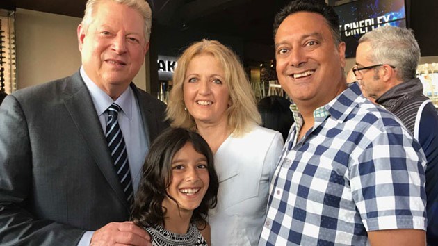 « Cathy Orlando, responsable de la sensibilisation internationale pour le lobby Citoyens pour le climat, au centre, est satisfaite du nouveau plan du gouvernement Trudeau concernant la taxe carbone. Elle a été vue ici avec l'ancien vice-président américain Al Gore, son mari Sanjiv Mathur et leur fille Sophia Mathur. » (Source)