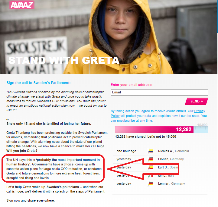 Il n'est pas surprenant qu'Avaaz ait effacé ces commentaires de Greta, considérant qu'une fonction première d'Avaaz est de promouvoir des solutions de marché qui accélèrent la croissance économique « verte » - pour servir « un très petit nombre de personnes qui continuent à gagner énormément d'argent ».