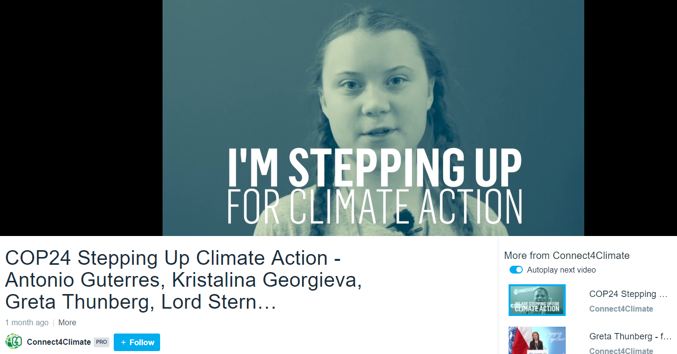 2) La COP24 Stepping Up Climate Action (COP24 Intensifier l'action pour le climat) est une campagne lancée par l'ONU avec Connect4Climate. Greta Thunberg fait partie de la campagne des « leaders, penseurs, activistes et influenceurs du monde entier ». « Connect4Climate est un programme de partenariat mondial dans le cadre du Fonds d'affectation spéciale multidonateurs du Groupe de la Banque mondiale pour la communication sur le changement climatique. Le Fonds d'affectation spéciale a été créé à l'initiative du Ministère italien de l'environnement et, en 2014, il a été rejoint par le Ministère fédéral allemand de la coopération économique et du développement ».