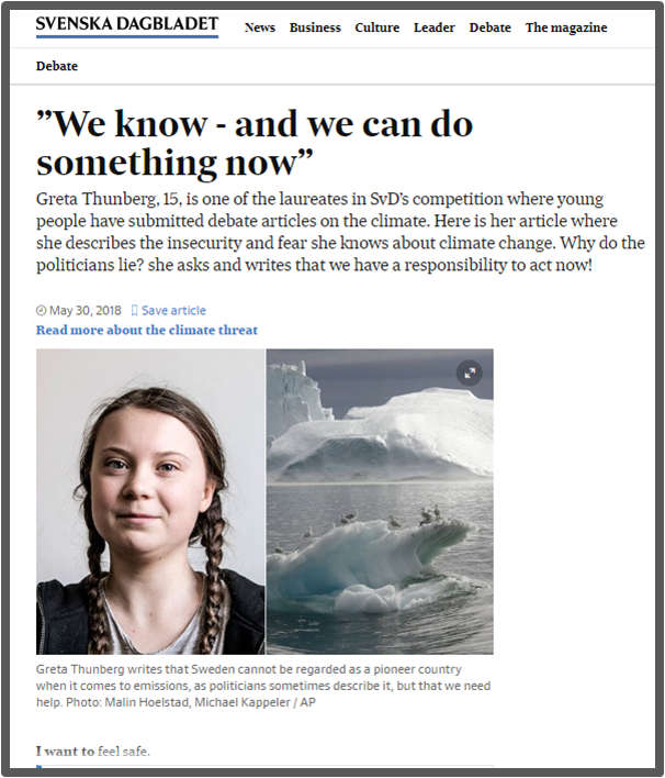 Le mois précédent, le 1er septembre 2018, Dagens Nyheter, le journal le plus en vue de Suède, avait publié une tribune de l'ONG suédoise Global Challenges intitulé « The Acute Climate Crisis Requires a Broad Political Gathering » (« La gravité de la crise climatique exige un large rassemblement politique »)