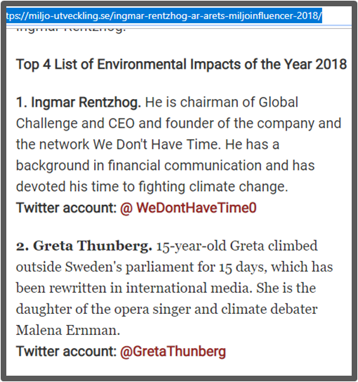 En octobre 2018, Miljö & Utveckling a reconnu Ingmar Rentzhog, fondateur de We Don't Have Time, meilleur influenceur environnemental de l'année en Suède. (Source : The Secret Sauce of a Global Climate Movement)