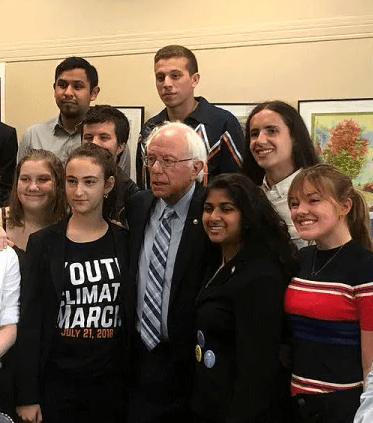 20 juillet 2018 : Jamie Margolin, de Zero Hour, est à gauche de Bernie Sanders (au centre). Xiuhtezcatl Martinez est au dernier rang, à l'extrême droite. « Les organisateurs de Zero Hour rencontrent le sénateur Bernie Sanders pendant leur journée de lobbying jeudi. » Photo : Avec l'aimable autorisation de Zero Hour (Source)