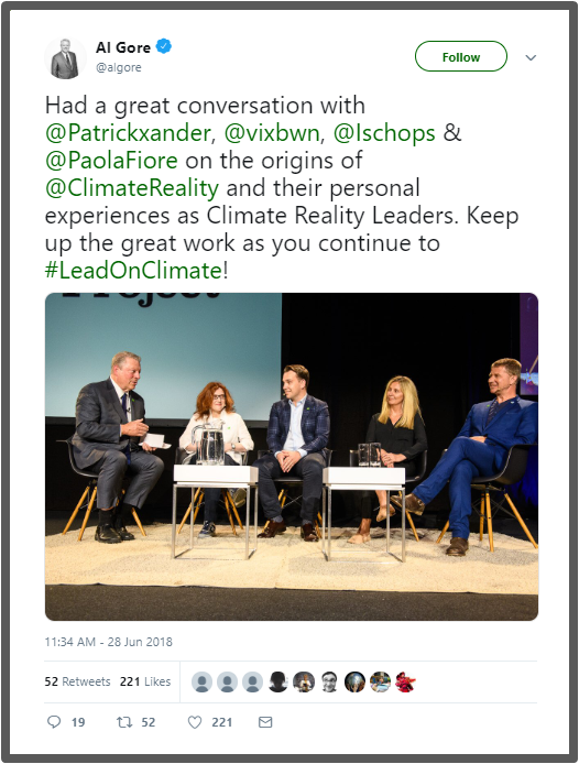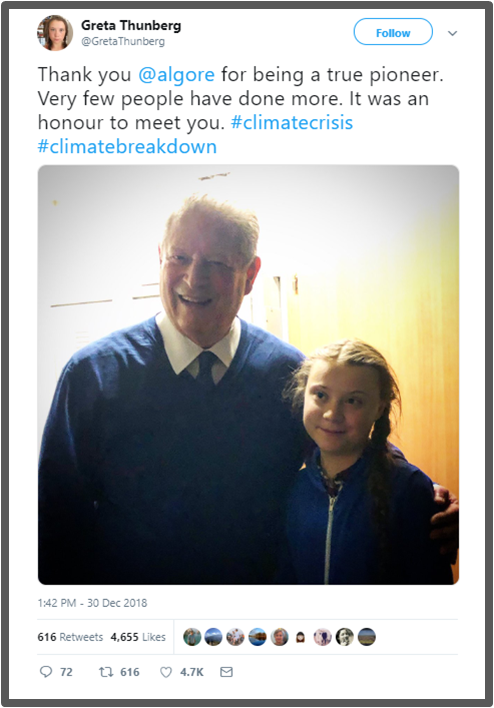 « Merci au vice-président @algore pour votre soutien et votre appui au mouvement #ThisIsZeroHour »( 20 septembre 2018, Twitter).