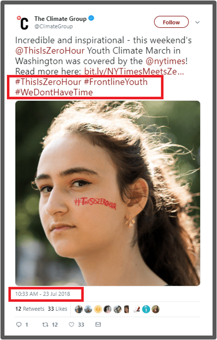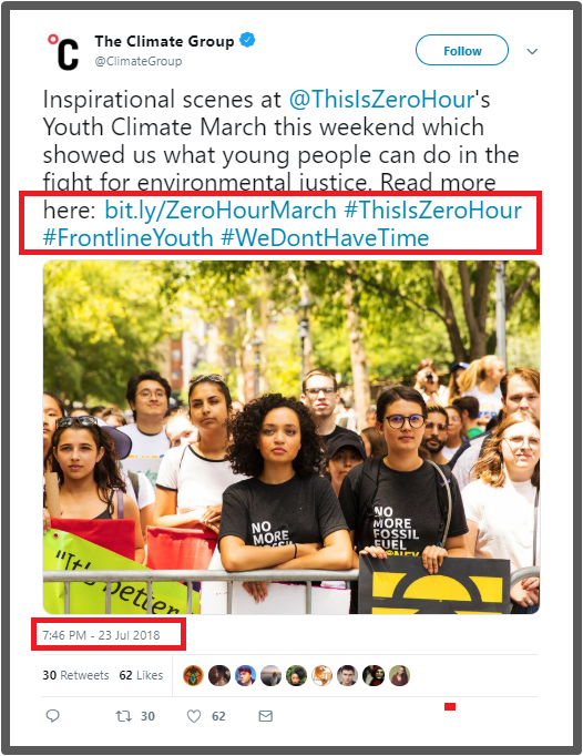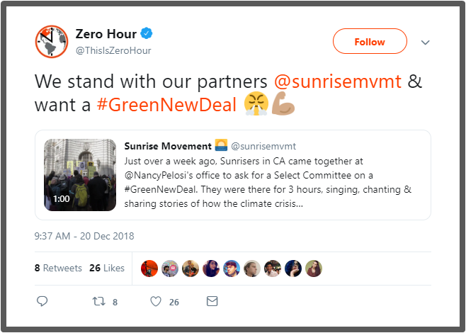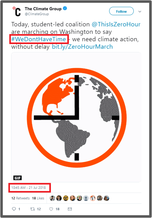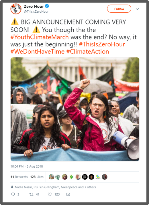 Le plus remarquable échange en ligne a peut-être a été les mots d'encouragement » adressés par le Climate Group (6), sur Twitter, à Zero Hour pour avoir dirigé la Marche des jeunes pour le climat en juillet 2018. Les hashtags utilisés dans les tweets du Climate Group sont également importants : #WeDontHaveTime and #FrontlineYouth. Cela éclaire efficacement la stratégie et les acteurs-clés derrière le « mouvement climatique » - où les ONG, leurs donateurs et les entreprises font tous partie de la même équipe.