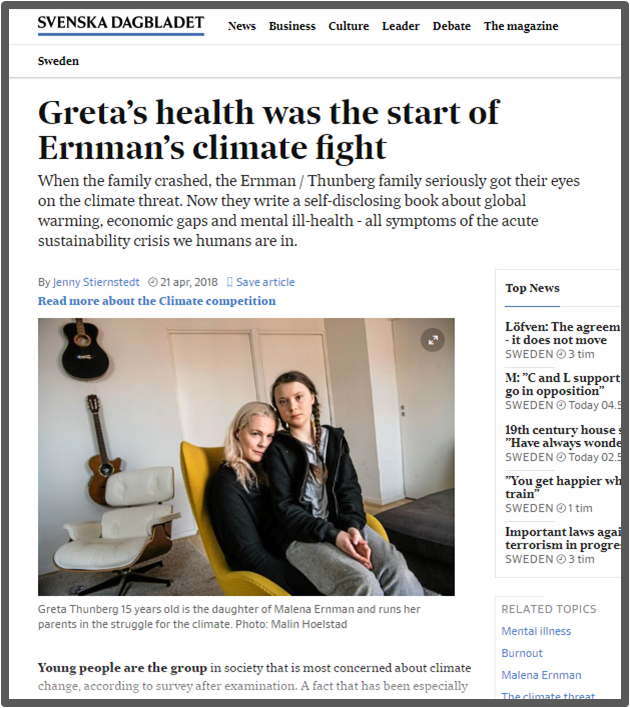 Le journal Svenska Dagbladet (SvD) est le troisième journal le plus diffusé en Suède. Il a été généreux dans sa couverture de Thunberg et de sa mère, Ernman.