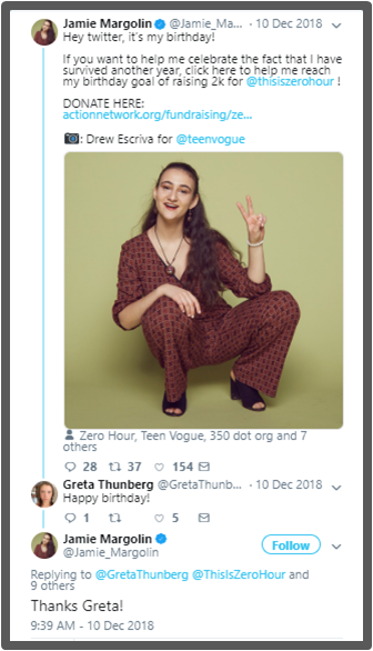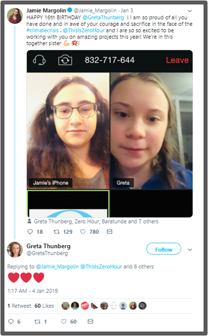 4 janvier 2019 : « Bon anniversaire, Greta Thunberg Je suis si fière de tout ce que tu as fait et admirative de ton courage et sacrifice face à la #criseduclimat. This Is Zero Hour et moi sommes enthousiasmés à l'idée de travailler avec toi sur des projets épatants cette année. Nous sommes ensemble, ma soeur ». (Le mot « together », « ensemble », est de toute évidence un des éléments de langage à placer à chaque occasion possible, NdT)