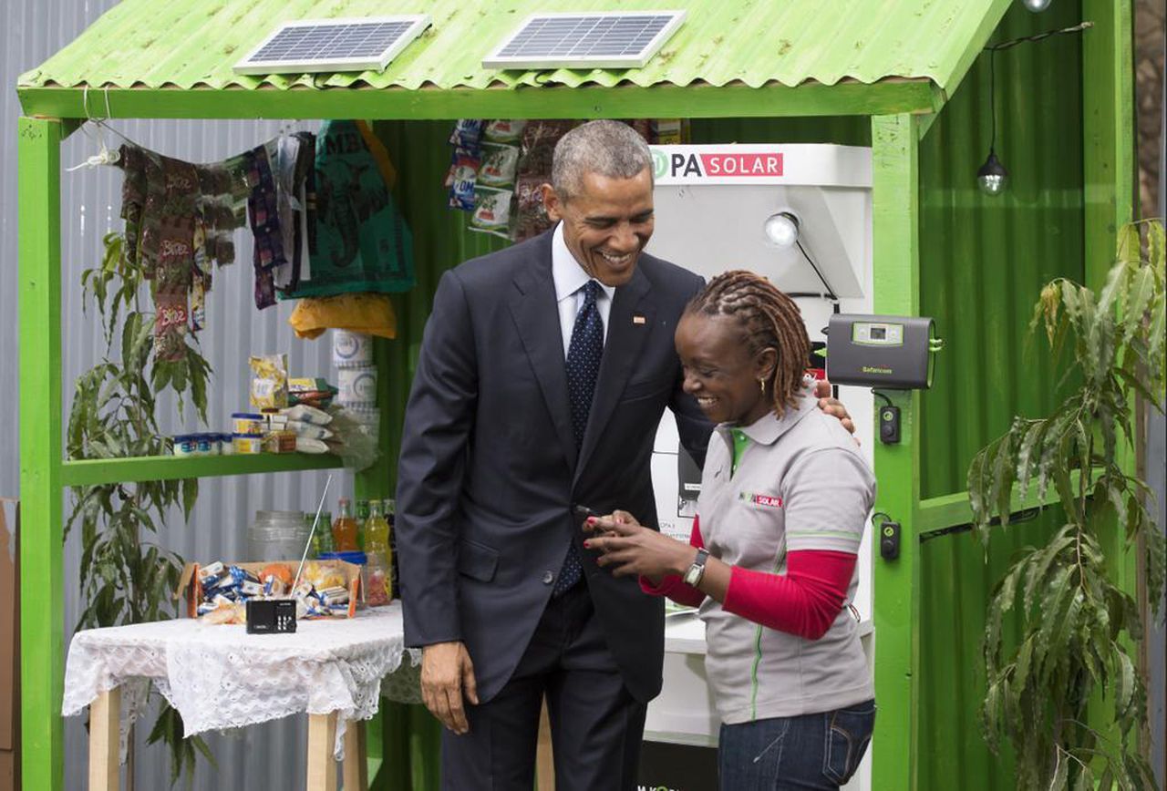 Entre deux campagnes de bombardements de pays africains, l'ancien président américain Barack Obama a trouvé le temps de visiter la société solaire M-Kopa. « Le président américain Barack Obama s'entretient avec June Muli, responsable du service clientèle de M-Kopa, lors du Sommet mondial de l'entreprise à Nairobi en juillet 2015. Photo : M-Kopa. » (Source : Forbes)