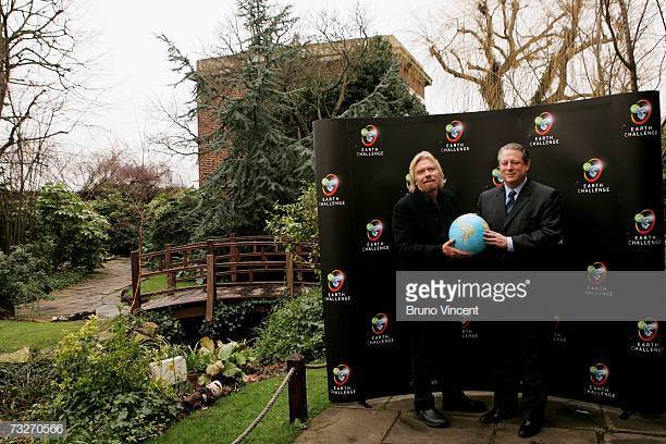 Le 9 février 2007 : Sir Richard Branson (à gauche) et l'ancien vice-président des États-Unis d'Amérique Al Gore posent lors du lancement du Virgin Earth Challenge à Londres. Le défi consiste à créer un fonds de 25 millions de dollars pour des produits durables afin d'éliminer au moins 1 milliard de tonnes de dioxyde de carbone atmosphérique par an. (Photo par Bruno Vincent/Getty Images)