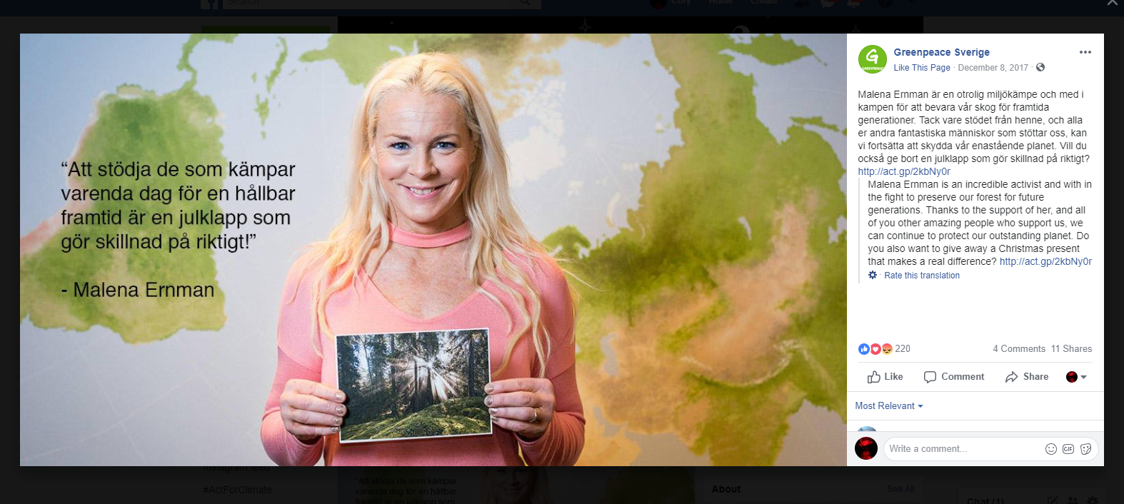 Greenpeace Suède : « Malena Ernman est une activiste incroyable dans la lutte pour préserver notre forêt pour les générations futures. Grâce à son soutien et à celui de toutes les personnes extraordinaires qui nous soutiennent, nous pouvons continuer à protéger notre planète exceptionnelle. Voulez-vous aussi offrir un cadeau de Noël qui fait une réelle différence ? » (Source : Facebook)