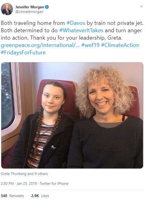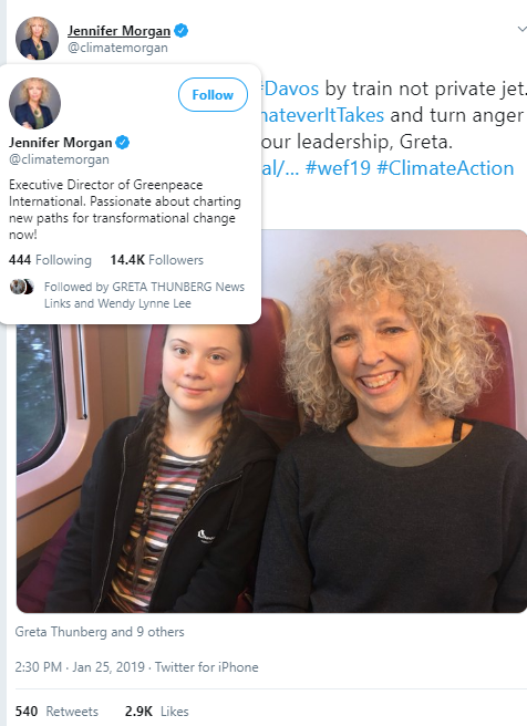 La photo ci-dessus de Thunberg sur le chemin du retour de Davos a été partagée sur les réseaux sociaux le 25 janvier 2019. La femme qui accompagne Thunberg et qui a partagé la photo n'est ni la mère ni la grand-mère de Thunberg. Il s'agit de Jennifer Morgan, directrice exécutive de Greenpeace International. Et c'est là que toutes les pièces de notre puzzle s'emboîtent enfin.
