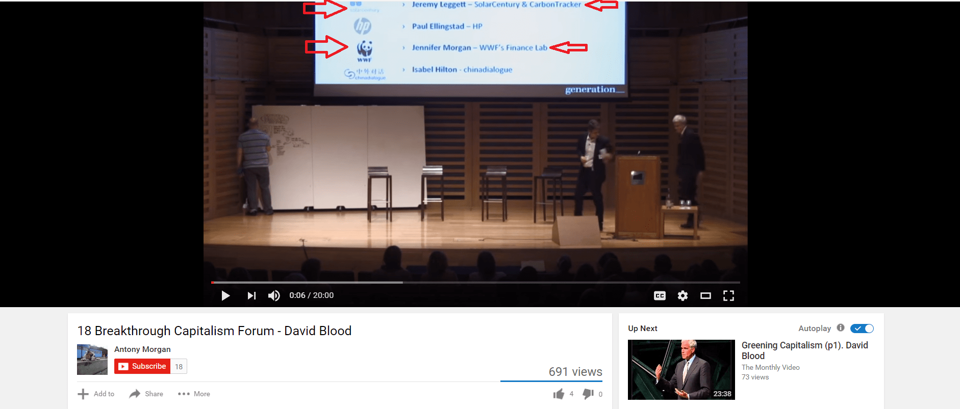Dans cette capture d'écran de la conférence David Blood 2012 (vidéo) , « Breakthrough Capitalism Forum - David Blood », on peut voir les sponsors en arrière-plan. En haut de l'écran, nous pouvons identifier les conférenciers et commanditaires Jeremy Leggitt de Solar Century & Carbon Tracker, et Jennifer Morgan du WWF, pour n'en nommer que deux. (Voir la liste complète des partenaires de Breakthrough Capitalism.) (Source)