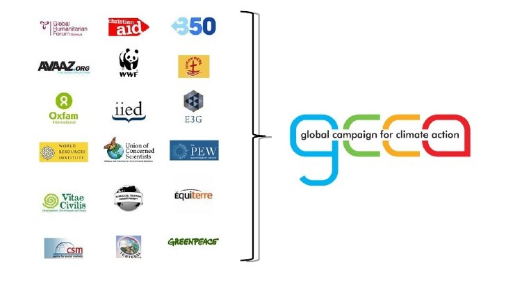 GCCA (TckTckTck) a été fondée par un petit groupe d'ONG, dont le World Resources Institute (WRI), 350.org, Greenpeace, Avaaz et le WWF. Elle a 470 partenaires, notamment ClimateWorks (fondée en 2008 par les fondations Hewlett, Packard et McKnight), dont il sera question plus loin dans ce segment. La Semaine du climat NYC 2014 (22-26 septembre), une initiative annuelle du Climate Group, a été relayée par les médias conjointement avec la Marche pour le climat, qui a eu lieu le 21 septembre 2014. La Semaine du climat NYC a été fondée en 2009 en tant que partenariat entre The Climate Group, les Nations Unies, la Fondation des Nations Unies, GCCA/TckTckTck, le Carbon Disclosure Project, le gouvernement du Danemark et la Ville de New York.