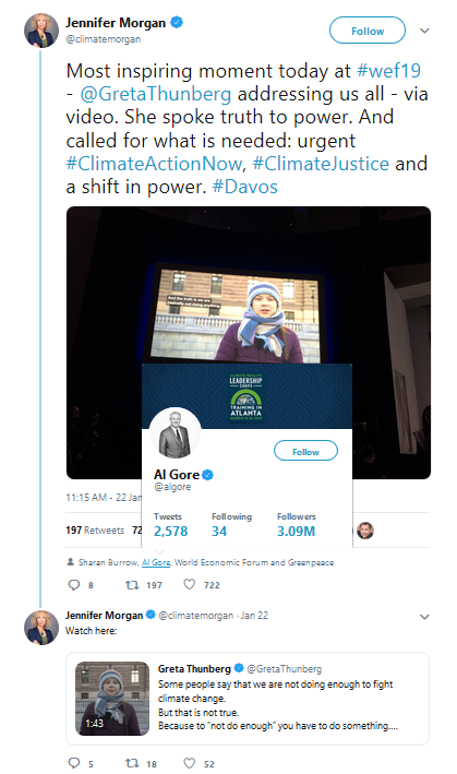 22 janvier 2019, Twitter, comptes tagués : Al Gore, Forum économique mondial, Sharan Burrow, Greenpeace International