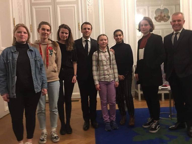 23 février 2019 : « Le président français Macron a reçu la jeune Suédoise Greta Thunberg (juste derrière Macron) et une délégation de Youth for Climate, dont Anuna De Wever (deuxième à droite) et Kyra Gantois (première à gauche) ». (Source)