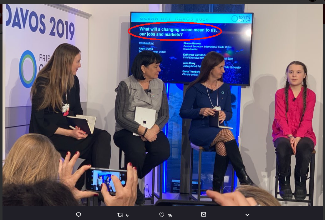 Lors du Forum économique mondial (WEF) de Davos en janvier 2019, la célébrité de Thunberg a été pleinement utilisée pour donner aux citoyens l'illusion d'un nouveau « capitalisme compassionnel ». C'était particulièrement vrai pour le programme Journée mondiale de l'océan du WEF, où Thunberg a participé à la table ronde « Qu'est-ce qu'un océan en évolution signifie pour nous, nos emplois et nos marchés ? » Alors que les membres du groupe d'experts (dont Angel Gurría, secrétaire général de l'Organisation de coopération et de développement économiques) ont parlé de l'océan comme d'un marché à risque (« si nous ne sauvons pas les océans, cela représente une perte de 24 billions de dollars »), l'innocence de Thunberg a créé un vernis de légitimité sur cette réification grotesque de la nature. Pendant ce temps, Al Gore siégeait au panel « Agir pour l'océan » (« l'économie de l'océan » représenterait entre 3 et 5 % du PIB mondial, avec des actifs évalués à 24 000 milliards de dollars. Comment le monde peut-il puiser dans l'économie océanique tout en la protégeant de l'effondrement environnemental ? ») pour y discuter des grèves climatiques mondiales (en tant que signe central de changement - à environ 30m:10s) et de la nécessité d'attribuer une valeur monétaire à la nature. Bien sûr, le moment-clé de l'exploitation de Thunberg (et le but même de la construction de son image mondiale) a eu lieu au moment où elle a prononcé ses mots très médiatisés « Notre maison est en feu. Je suis ici pour dire que notre maison est en feu. » Ces mots reprenaient presque mot pour mot le texte du document de stratégie intitulé « Mener le public en mode d'urgence ». La stratégie, dont l'auteur est le Climate Mobilization Project (Projet de mobilisation contre le changement climatique), décrit une » mobilisation de type guerre, semblable à l'effort du front intérieur américain pendant la Seconde Guerre mondiale «. (voir l'Acte IV)