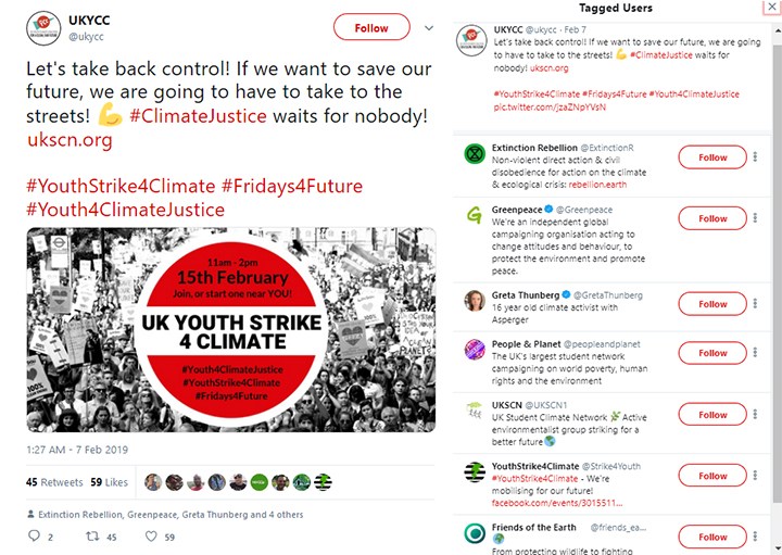 7 février 2019, tweet du UKYCC. Utilisateurs marqués : Extinction Rebellion, Greenpeace, Greta Thunberg, People & Planet (le plus grand réseau étudiant du Royaume-Uni), UKSCN, YouthStrike4Climate et Friends of the Earth.