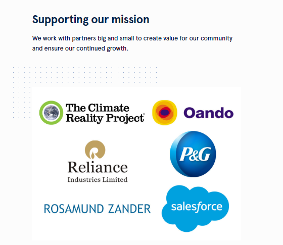 Les partenaires incluent : le Climate Reality Project, Coca-Cola, Salesforce, Procter and Gamble, Reliance Industries, Oando, GMR Group, Hanwha Energy Corporation, Rosamund Zander et Yara International.