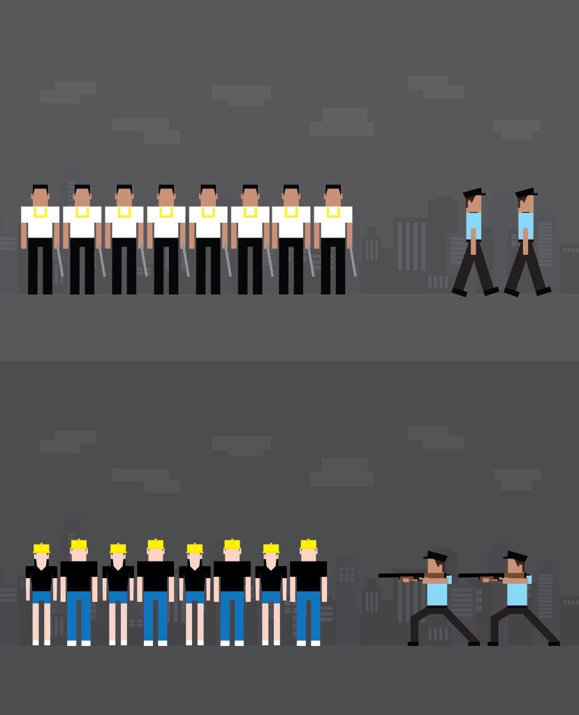 Carl Zha @CarlZha - 1:25 UTC - 31 juil. 2019 Les flics de Hong Kong à la peau foncée contre les manifestants de Hong Kong à la peau blanche. Je l'avais complètement raté, mais quelqu'un m'a fait remarquer que les bandes dessinées des Graphiste DDED pro-manifestants dépeignent les "méchants" flics de Hong Kong et les chemises blanches de Yuen Long avec un teint de peau foncée tandis que les protestataires sont dessinés avec une peau claire.