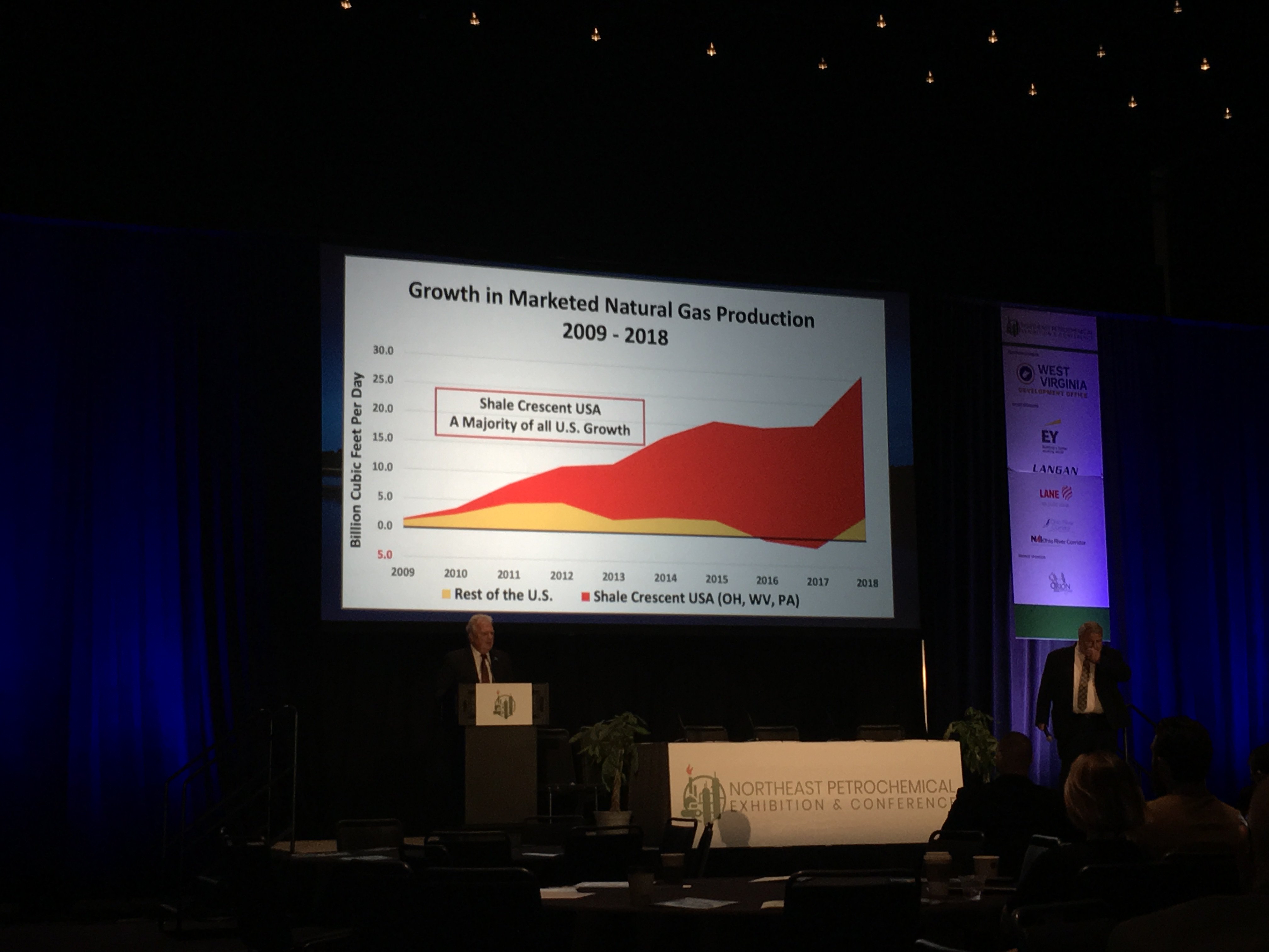 Shale Crescent USA, un groupe de l'industrie pétrochimique qui cherche à transformer la vallée de l'Ohio et les Appalaches en un centre de fabrication de plastiques et de produits chimiques pour rivaliser avec celui de la côte du Golfe - connu localement sous le nom de » couloir du cancer « - a présenté ses projections, qui prévoient une croissance rapide de la production, dans une présentation suivant celle de Schlotterbeck.