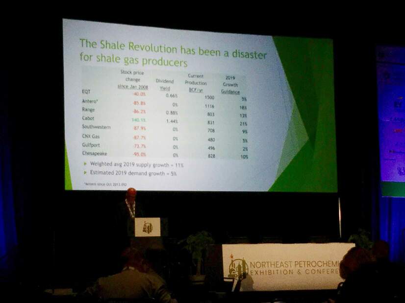 Lors de la conférence de vendredi, il a montré une diapositive montrant le cours des actions de huit grands foreurs de gaz de schiste de Marcellus : Antero, Range Resources, Cabot Oil and Gas, Southwestern Energy, CNX Gas, Gulfport, Chesapeake Energy et EQT, la société que Schlotterbeck a dirigée jusqu'à sa démission en mars 2018. Sept des huit sociétés ont vu le cours de leurs actions chuter de 40 % à 95 % depuis 2008, selon la diapositive.