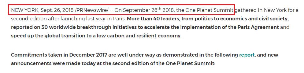 Traduction : « New York, 26 septembre 2018/ PRNewswire/- le 26 septembre 2018, le Sommet One Planet s'est réuni à New York pour sa deuxième édition après son lancement, l'année dernière à Paris. Plus de 40 leaders politiques, économiques et de la société civile, ont rendu compte de 30 initiatives révolutionnaires, à travers le monde, destinées à accélérer l'application de l'Accord de Paris et la transition mondiale à une économie basse en carbone et résiliente ».