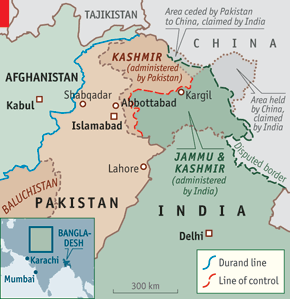 Cette vue comparative provient également de l'article du Monde Diplomatique cité en légende de la carte précédente. On y appréhende également le différend avec la Chine quant à la région d'Aksai Chin.