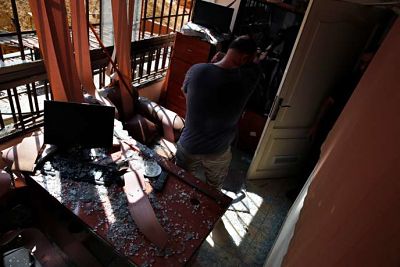 Dégâts provoqués par le tir d'un drone israélien dans le bureau des médias du Hezbollah le 25 août à l'aube à Beyrouth. (Bilal Hussein / AP)