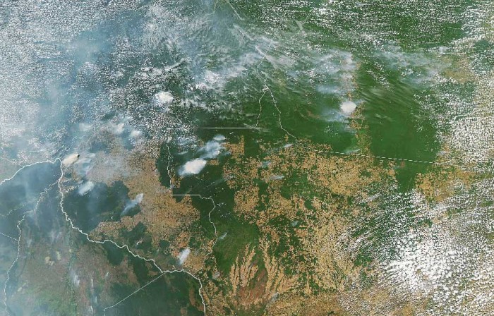 Image captée par l'Observatoire de la Nasa le 21 août, où l'on peut observer des foyers d'incendie qui dévastent l'Amazonie dans les États d'Amazonas, Mato Grosso et Rondonia. Photo AFP, Nasa, Lauren Dauphin