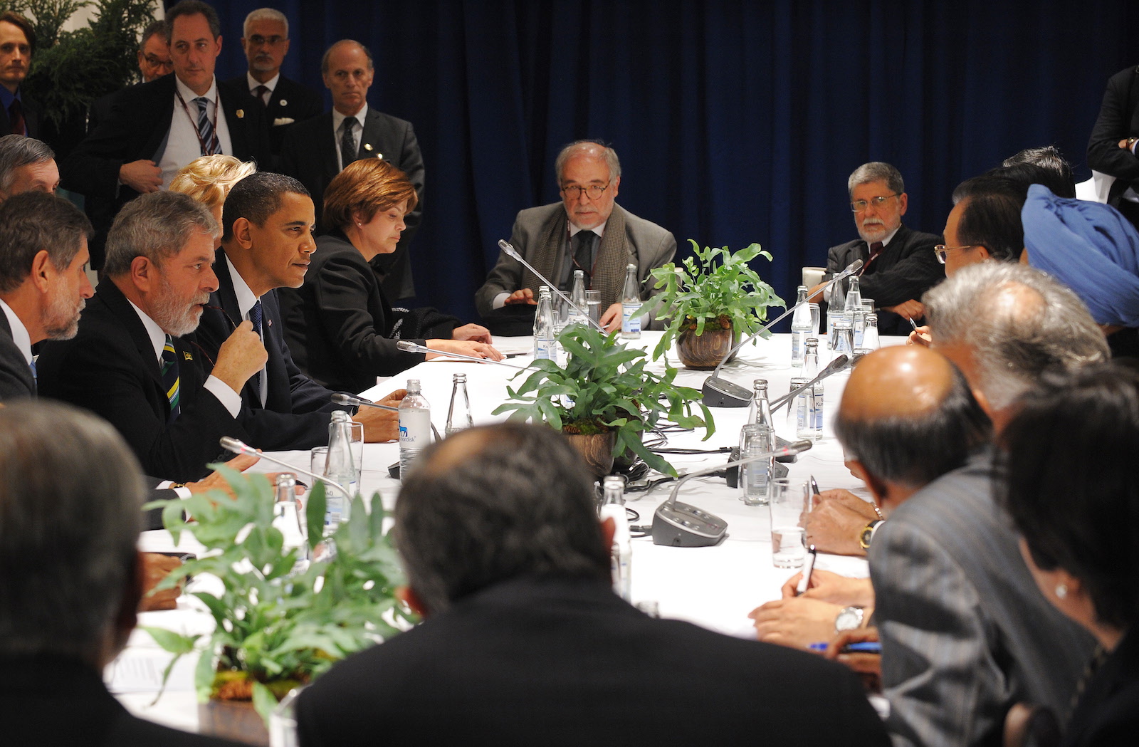 Puis on a laissé entrer Obama, Obama a dit : « Je vais m'asseoir à côté de mon ami Lula pour ne pas être attaqué ici. Il s'est donc assis à mes côtés et a commencé à parler de l'accord, et nous avons dit qu'il n'y avait pas d'accord. Et puis il y avait ce Chinois, un négociateur, il était tellement en colère contre Obama, il s'est levé, il parlait en mandarin, personne ne comprenait rien, nous avons demandé une traduction, Jiabao ne l'a pas permis, mais l'impression, par son geste, était que les Chinois lançaient toutes sortes de noms contre Obama, il a parlé de façon agressive, en montrant son doigt et Obama a dit : « Il est en colère ». L'ambassadrice du Brésil, qui comprenait un peu le mandarin a dit qu'il avait utilisé des mots assez lourds.Le fait concret est qu'au cours de cette réunion, nous avons acquis beaucoup de crédibilité, parce que nous avons refusé de blâmer les Chinois. Je me souviens d'une séance plénière où Sarkozy, Obama et moi-même devions prendre la parole. J'étais le dernier orateur. Quand je suis arrivé en plénière, il n'y avait rien, rien d'écrit sur un bout de papier. J'ai dit à l'un de mes assistants, s'il vous plaît, sortez, préparez quelques points de discussion pour moi, et quand il a quitté la salle, ils m'ont appelé pour parler ; ils avaient inversé l'horaire. J'étais très nerveux. Mais ce jour-là, j'ai fait un bon discours. Il a reçu une standing ovation. Je ne sais pas ce que j'ai dit comme bêtises (rires). Puis Obama a commencé à parler. Il n'avait rien à dire. Il y a donc eu cette rumeur grandissante en plénière : il a fini par faire un discours que personne n'a remarqué. Et puis avec Sarkozy, la même chose.